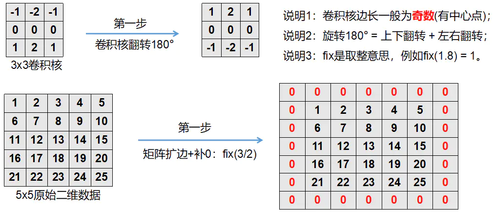 二维卷积实现可以分为两大步。一是预处理:将卷积核翻转180°,将原始数据扩边;二是滑动卷积计算。下面按这两个步骤分别说明: