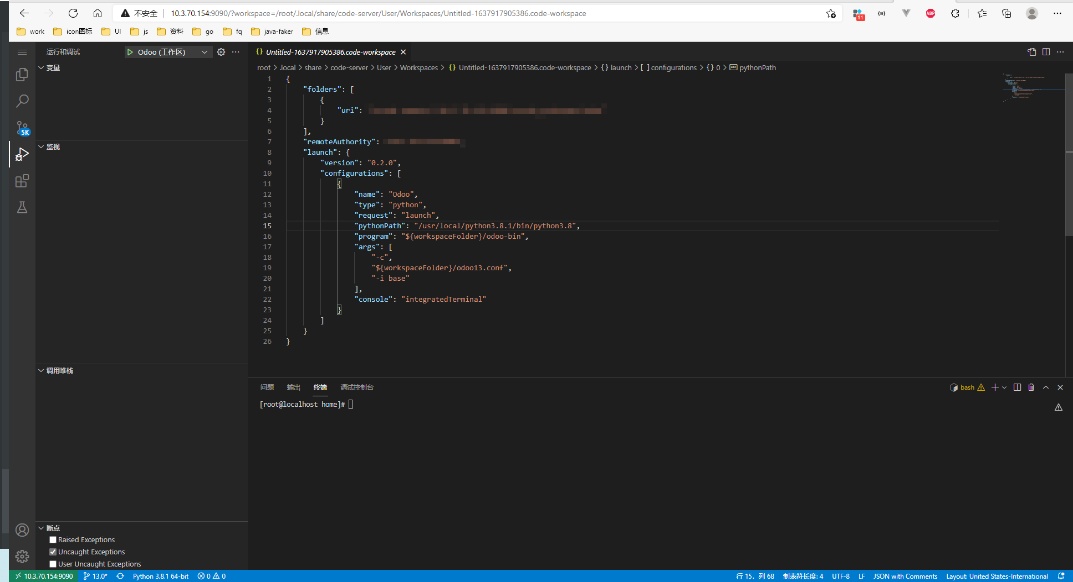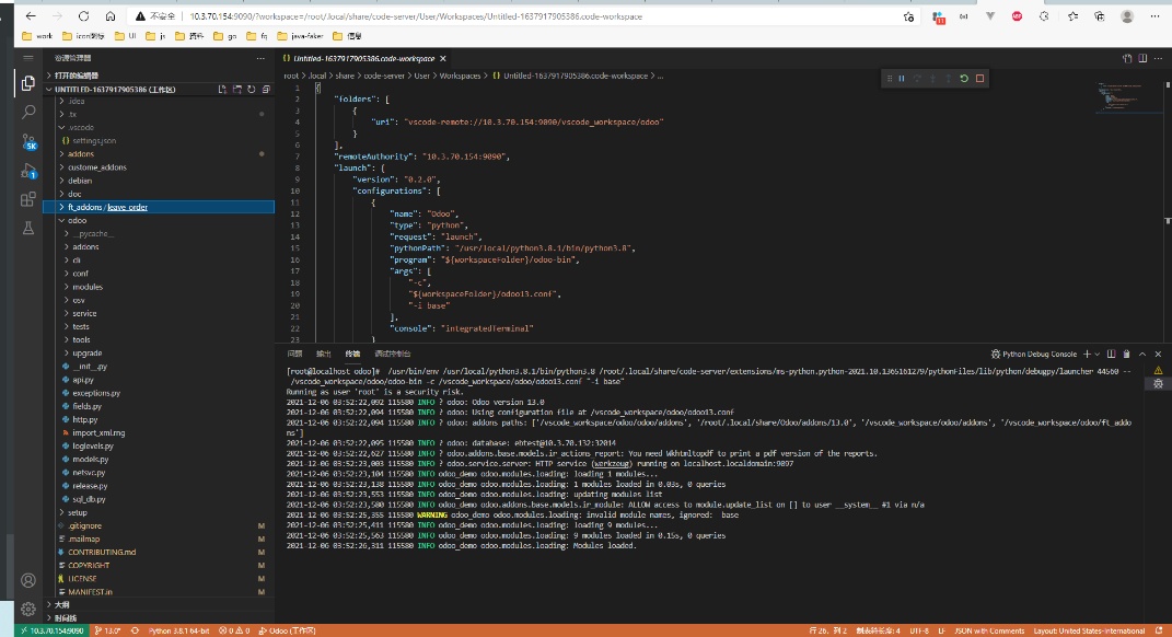 4.通过VScode配置好启动文件,启动Odoo服务,即可断点调试开发项目