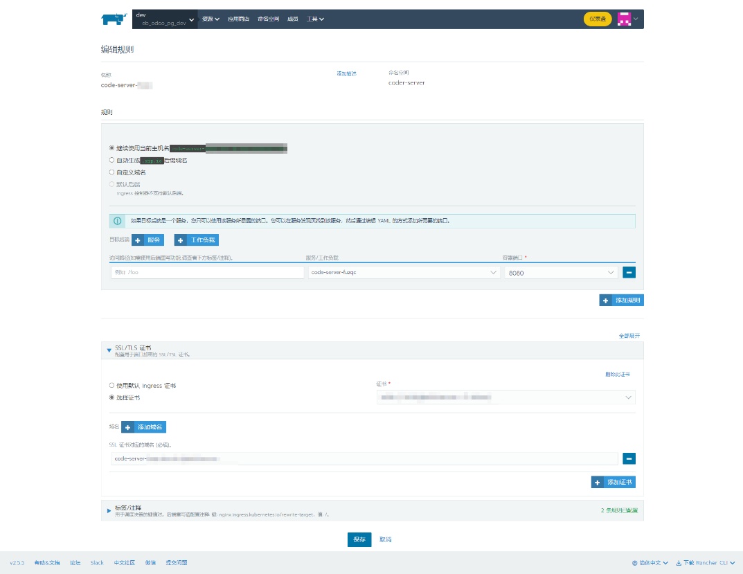 通过配置负载均衡添加规则,规则名称保持code-server-员工tcode 一致即可,确保命令空间和工作负载pod应用是一致,规则选择默认即可,SSL/TLS证书这里我使用已经导入配置好的证书和对应域名,自定义k8s集群按照自己配置好的证书和域名使用即可,配置完毕,即可通过https:code-server-xxx.自定义ssl证书对应域名。