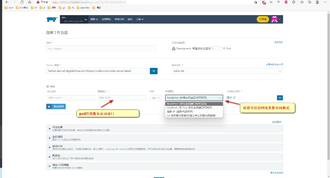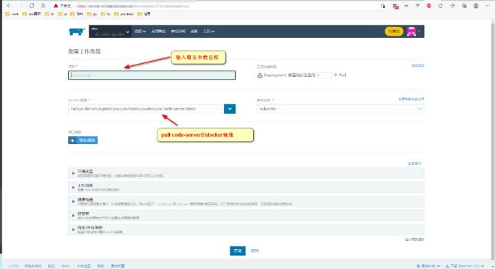 (1)设置工作负载名称,多人配置使用可以通过自定义规则,这里我通过公司分配好的itcode进行设置即可:code-server-员工tcode、pull code-server的官方镜像,网速较慢可以通过国内的镜像源pull,设置好pod资源deploy应用,选择已经创建好的命名空间即可。