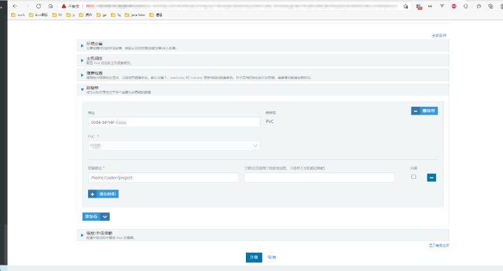 4.数据持久化设置:若还没新建PVC可以通过添加卷方式或者通过rancher资源的PVC设置添加好数据卷,数据卷容量根据开发使用需求可以分配code-server的持久化数据卷容量大小,本方案选择已经提前配置好的PVC,挂载到对应pod应用容器默认路径/home/coder/project 即可。