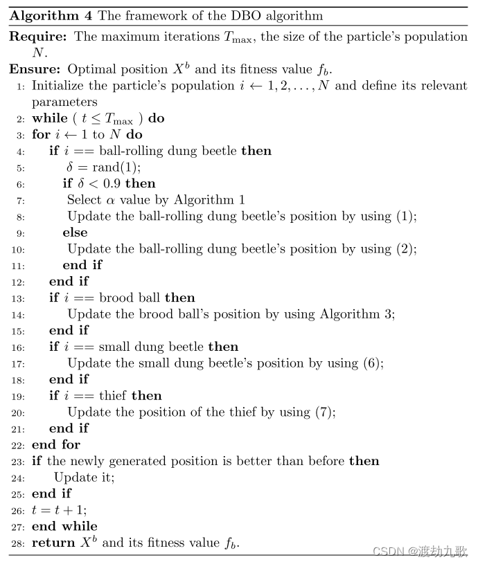 由于DBO算法将种群中的蜣螂划分成了四种不同的角色,因此它的计算流程会相对复杂一些,需要执行滚球、繁殖、觅食和偷窃四种算子。这里我用伪代码给出了它的计算流程: