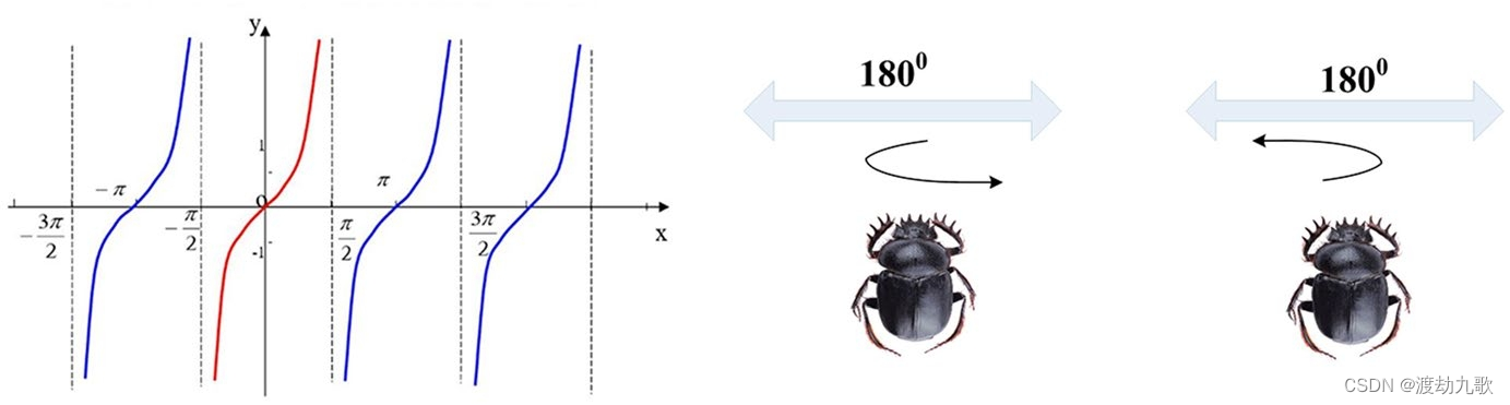 为了模拟舞蹈行为,我们使用正切函数来获得新的滚动方向。需要说明的是,我们只需要考虑在区间上定义的切函数的值,如图3所示。一旦蜣螂成功地确定了一个新的方向,它应该继续向后滚动球。因此,将滚球蜣螂的位置更新定义如下: