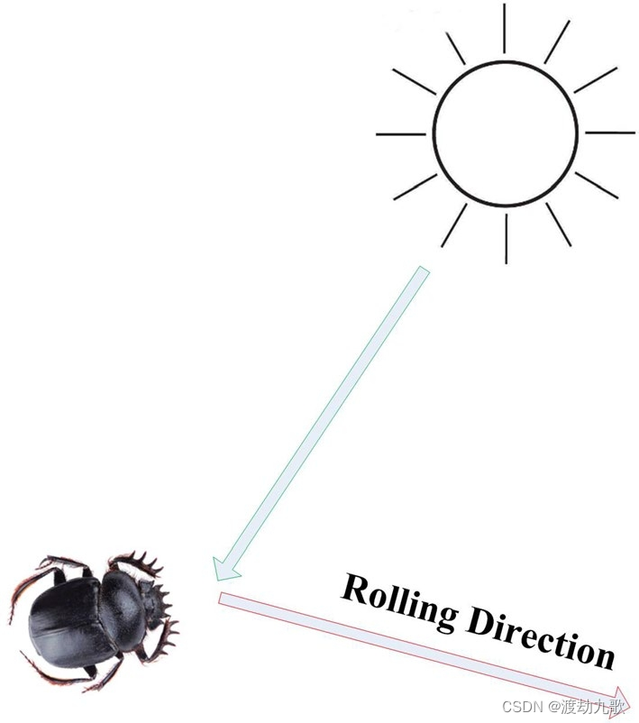 根据上面的讨论,我们知道蜣螂在滚动过程中需要通过天体线索来导航,以保持粪球在一条直线上滚动。为了模拟滚球行为,蜣螂需要在整个搜索空间中沿着给定的方向移动。屎壳郎的飞行轨迹如图2所示。在这张图中,我们可以看到蜣螂利用太阳来导航,其中红色箭头表示滚动方向。在本文中,我们假设光源的强度也会影响蜣螂的路径。在滚动过程中,滚球蜣螂的位置被更新,可以表示为