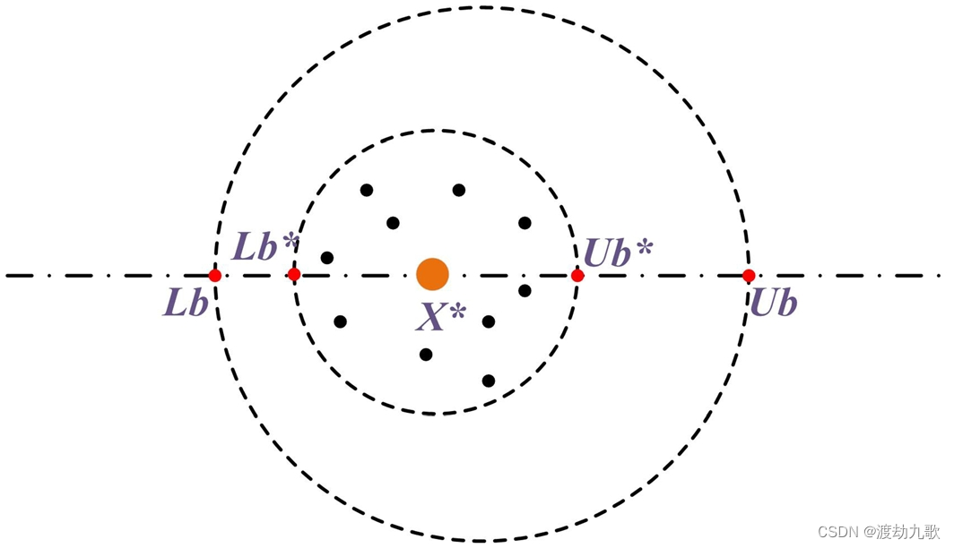 周围的小黑色圆圈表示育雏球。请注意,每个育仔球都包含一枚屎壳虫卵(见图4)。此外,红色小圆圈代表边界的上下限。一旦确定了产卵区域,雌性蜣螂就会选择这个区域的卵球产卵。需要说明的是,对于DBO算法,每只雌性蜣螂在每次迭代中只产生一个卵。此外,由(3)可以清楚地看出,产卵区的边界范围是动态变化的,这主要是由R值决定的。因此,孵化球的位置在迭代过程中也是动态的,定义为