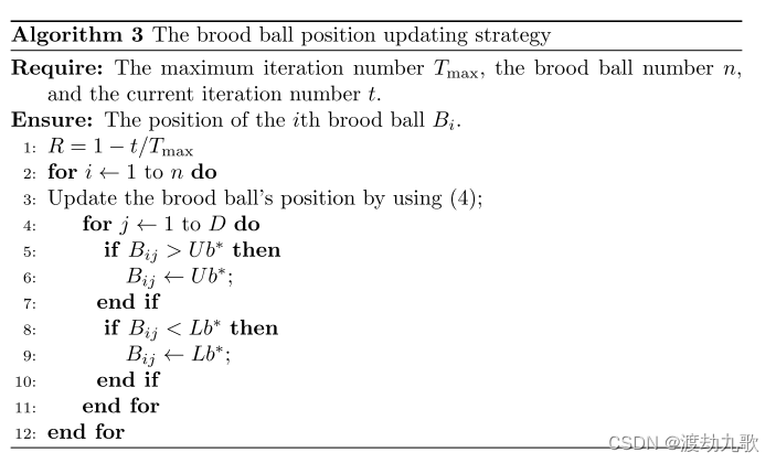表示大小为1 × D的两个独立随机向量,D表示优化问题的维数。注意孵蛋球的位置被严格限制在一定范围内,即产卵区域(见算法3)。