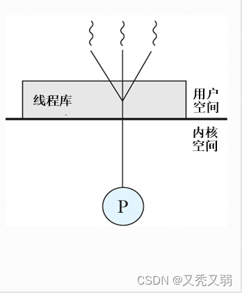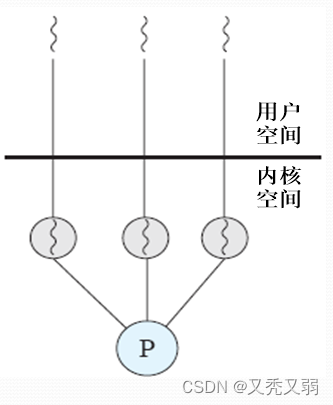 - 应用程序线程在用户态运行,线程调度和管理在内核实现,在同一进程中,控制权从一个线程传送到另一个线程时需要模式切换,系统开销较大