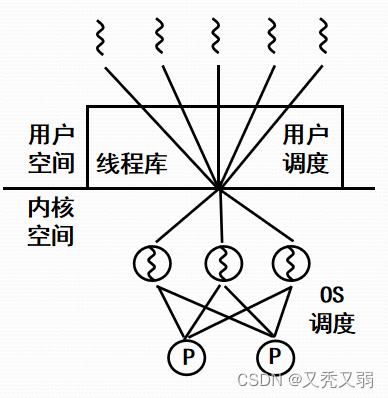- 一个应用中的多个用户级线程被映射到一些(小于等于用户级线程数目)内核级线程上