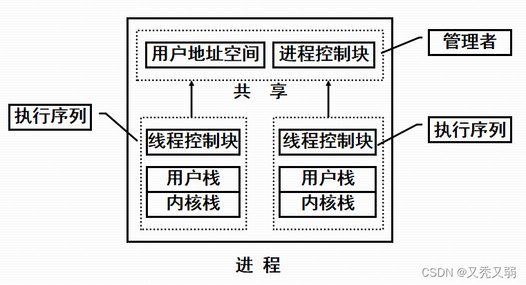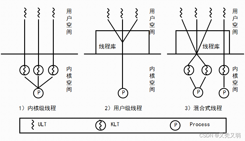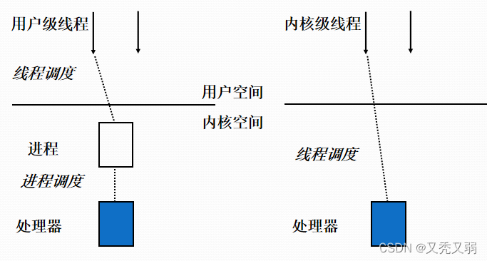 - 线程创建完全在用户空间中完成,线程的调度和同步也在应用程序中进行