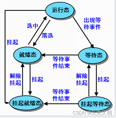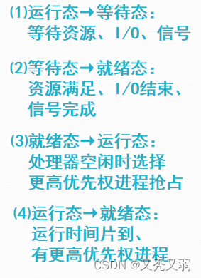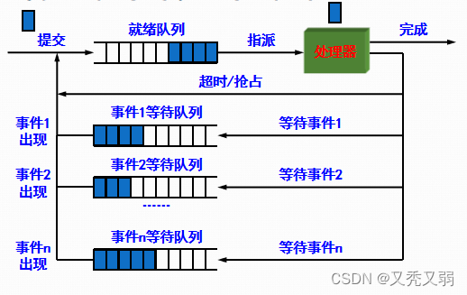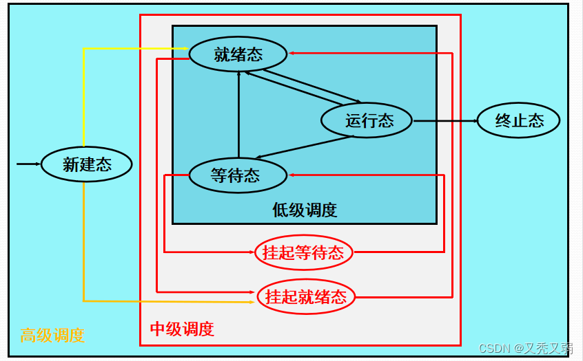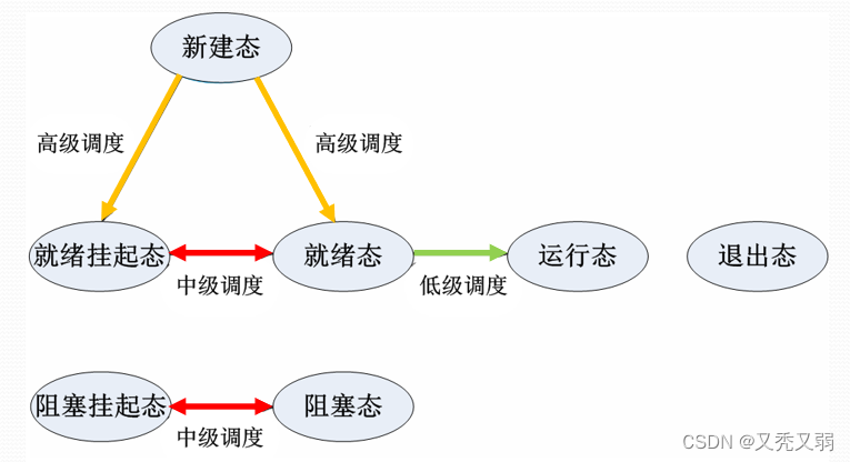 - 低级调度:又称处理器调度、进程调度、短程调度,按照某种原则把处理器分配给就绪态进程或内核级线程