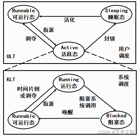 - KLT三态,系统调度负责 ULT三态,用户调度负责