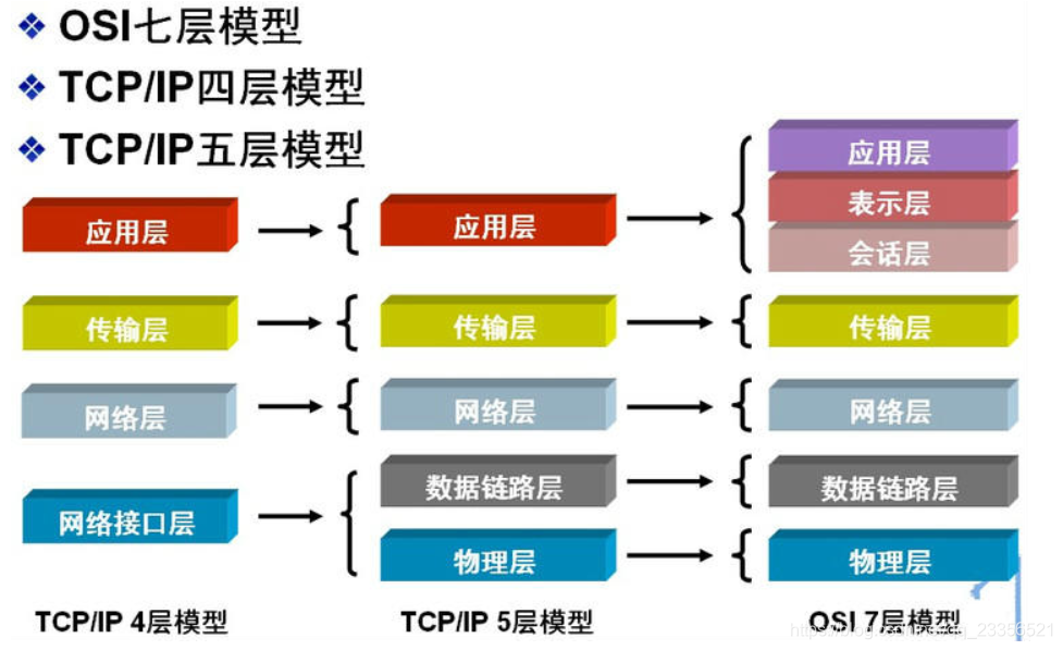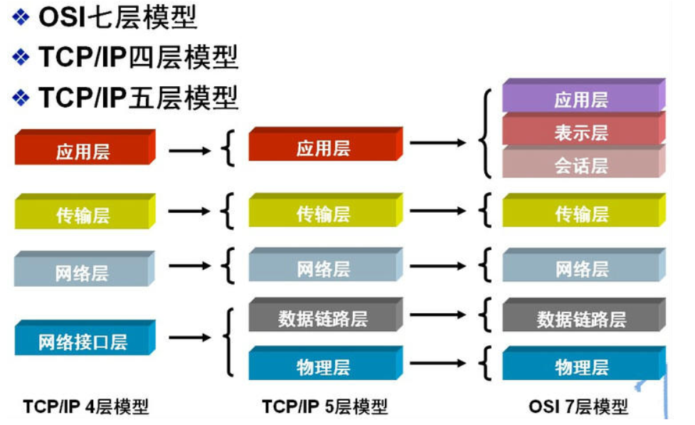 除了标准的OSI七层模型以外,常见的网络层次划分还有TCP/IP四层协议以及TCP/IP五层协议,它们之间的对应关系如下图所示: