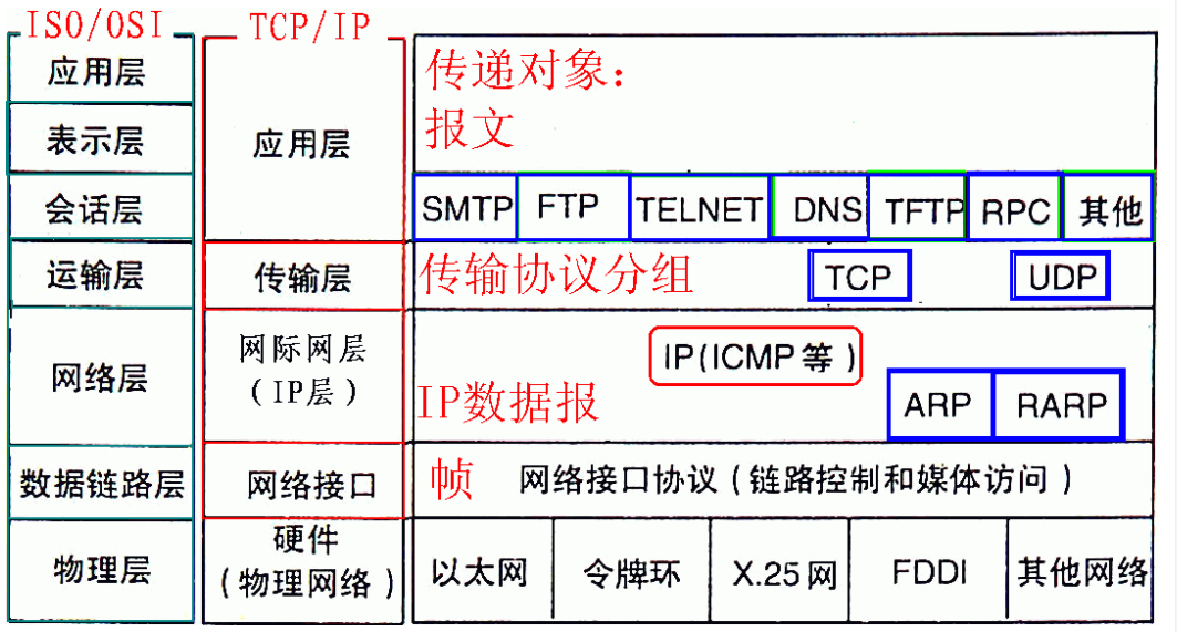 为了使不同计算机厂家生产的计算机能够相互通信,以便在更大的范围内建立计算机网络,国际标准化组织(ISO)在1978年提出了"开放系统互联参考模型",即著名的OSI/RM模型(Open System Interconnection/Reference Model)。它将计算机网络体系结构的通信协议划分为七层,自下而上依次为:物理层(Physics Layer)、数据链路层(Data Link Layer)、网络层(Network Layer)、传输层(Transport Layer)、会话层(Session Layer)、表示层(Presentation Layer)、应用层(Application Layer)。其中第四层完成数据传送服务,上面三层面向用户。