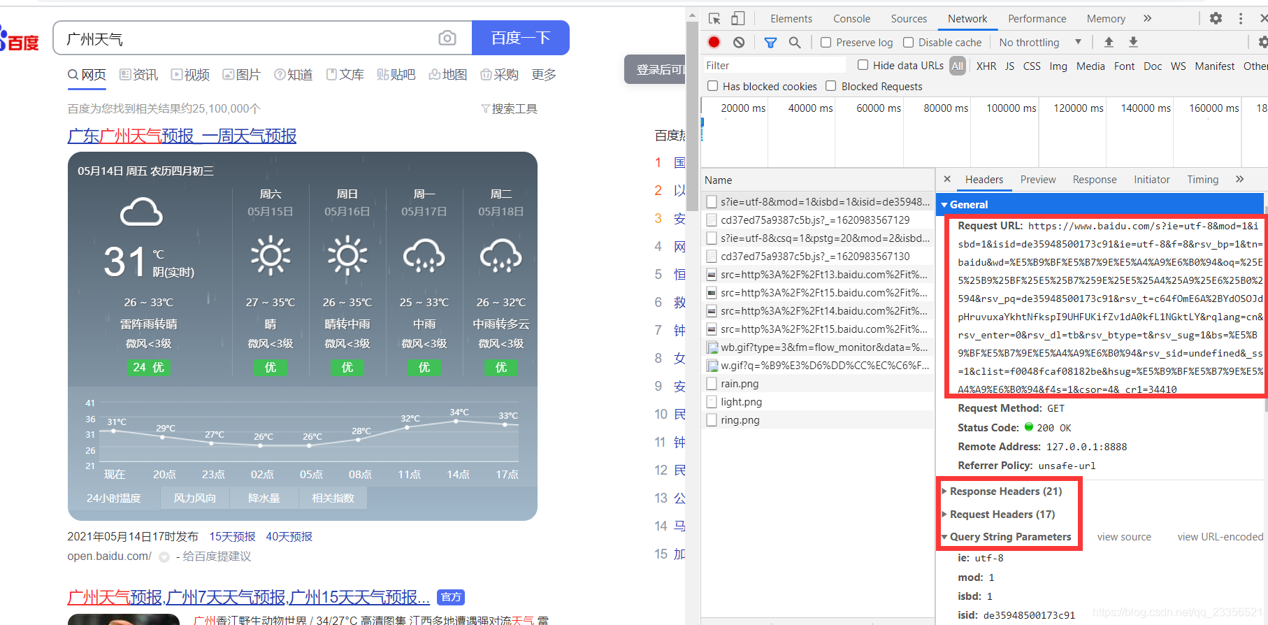 1.浏览器抓包,以百度搜索【广州天气】为例: