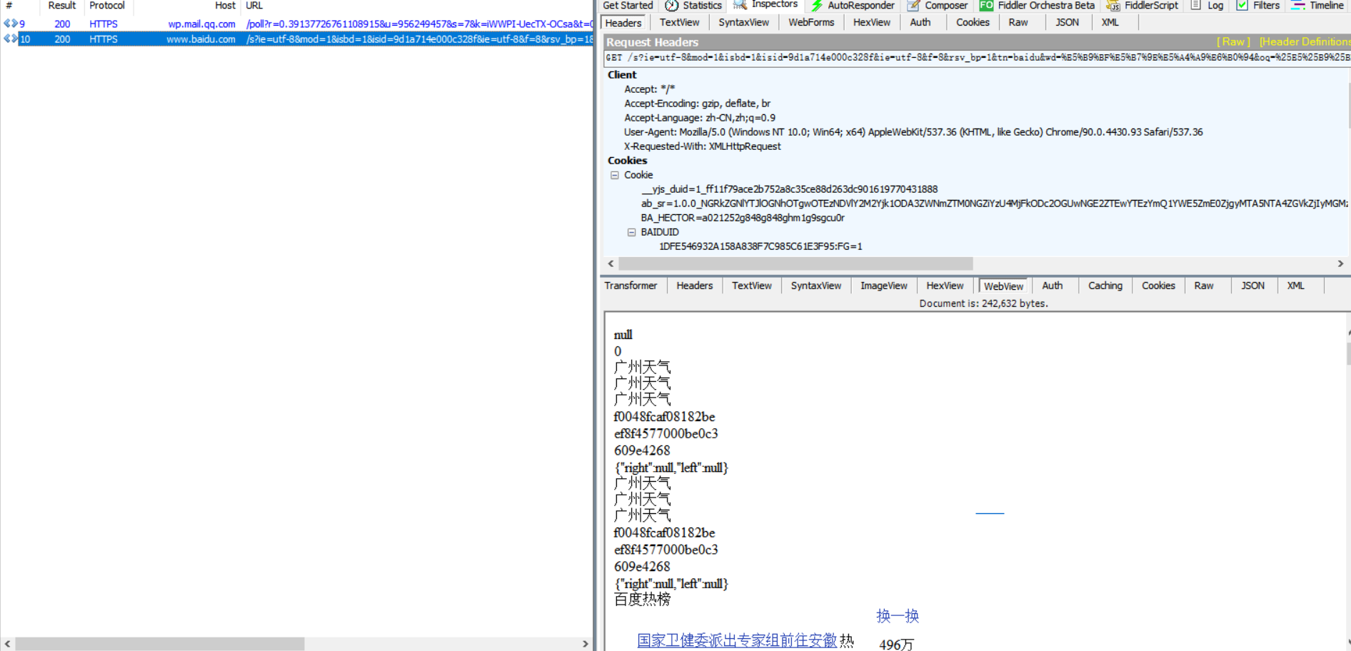 2.fiddler抓包,以百度搜索【广州天气】为例: