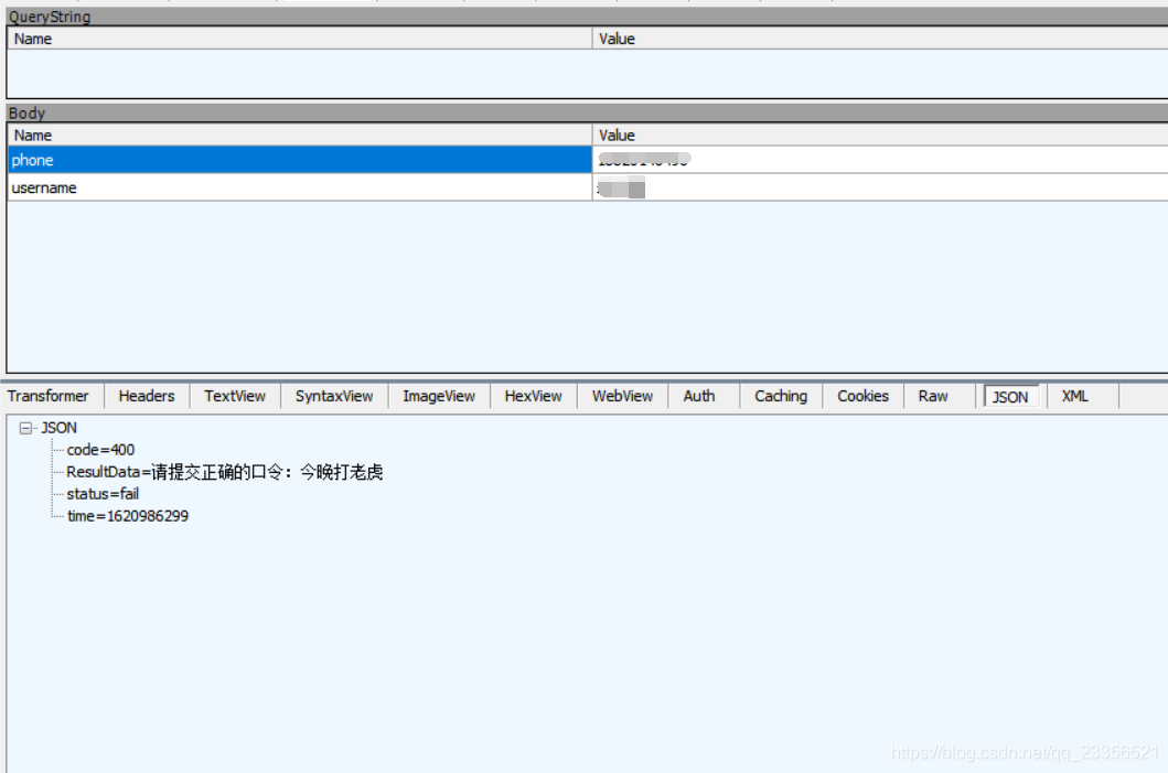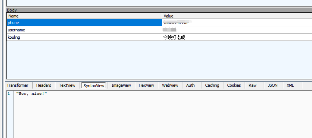 1.访问网址进入http://temp.blog8090.com/ ,提交手机号、姓名后抓包,发现暗号为:今晚打老虎