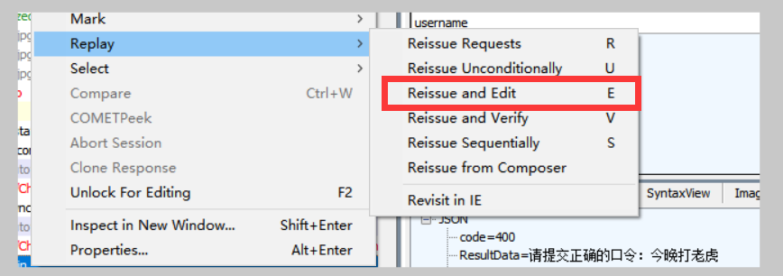 2.选中登录提交的请求,右键选择Replay-Reissue and Edit,重新编辑请求