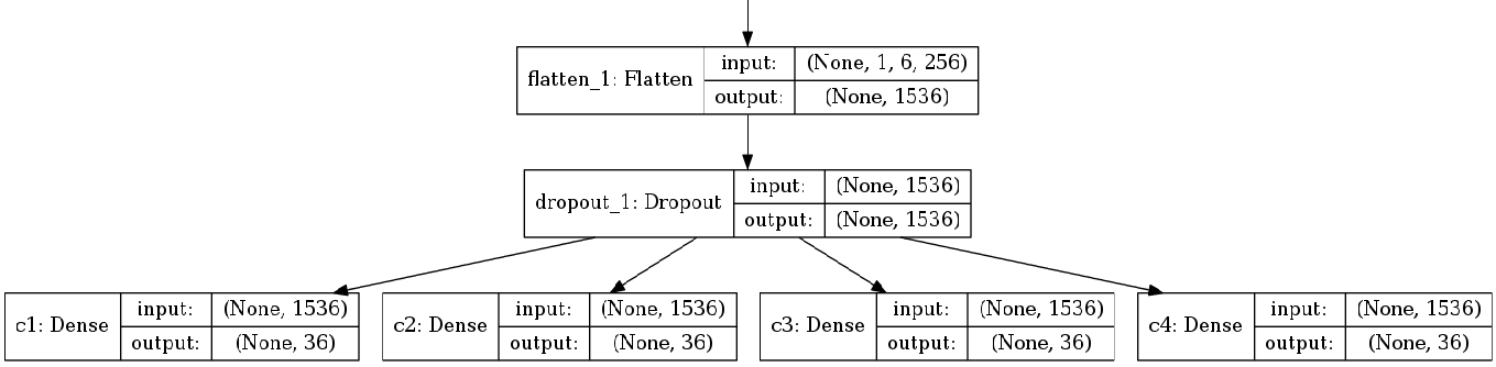构建深度CNN,最后连接4个分类器,每个分类器是36个神经元,输出36个字符的概率,可视化需要pydot和graphviz库