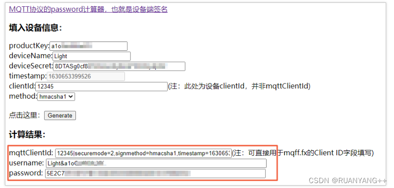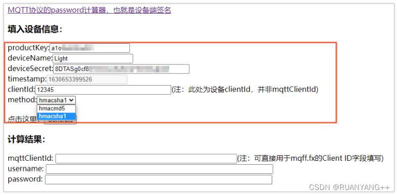 3.在MQTT签名计算页面,根据页面提示,输入对应信息,如下图所示。