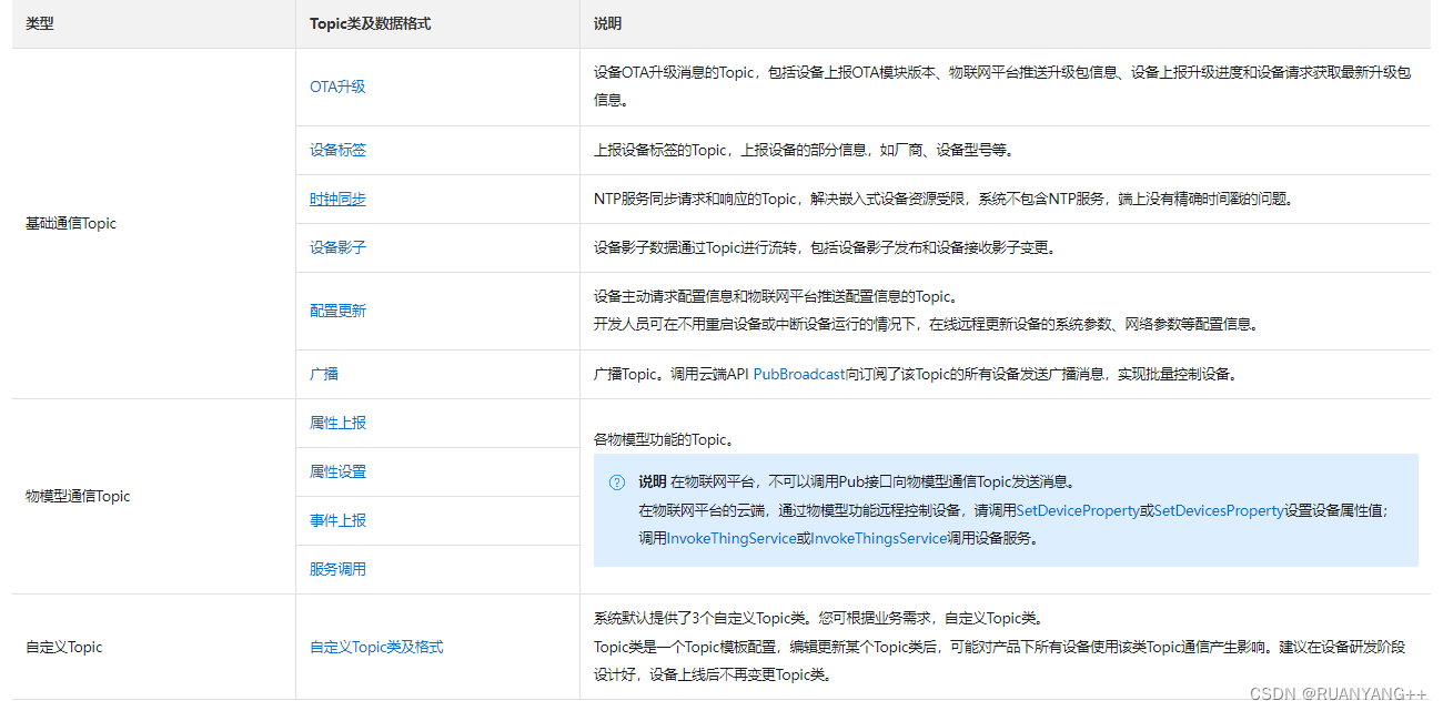 Topic类:产品维度的Topic,是同一产品下不同设备的Topic集合。一个ProductKey下有多个Topic类。一个Topic类对一个ProductKey下所有设备通用。
