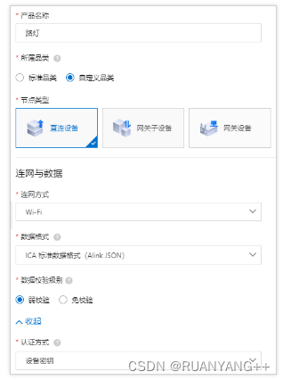 | 产品名称 | 为产品命名。产品名称在账号内具有唯一性。例如,可以填写为产品型号。支持中文、英文字母、日文、数字、下划线(_)、短划线(-)、at(@)和英文圆括号(()),长度限制4~30个字符,一个中文或日文占2个字符。 |