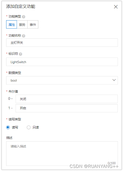 | 属性 | 用于描述设备运行时具体信息和状态。 例如,环境监测设备所读取的当前环境温度、智能灯开关状态、电风扇风力等级等。 属性可分为读写和只读两种类型。读写类型支持读取和设置属性值,只读类型仅支持读取属性值。 |