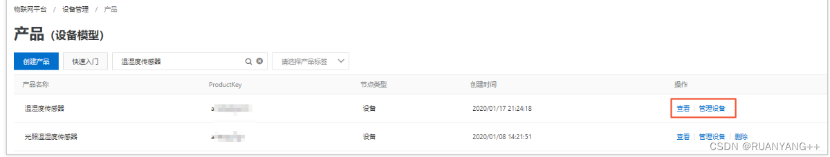 - 在左侧导航栏,选择设备管理 > 产品。在产品列表中,找到已创建的路灯产品,单击操作栏的查看。