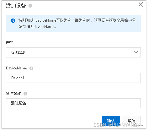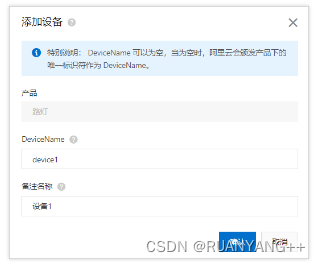 7.在设备列表页签,单击添加设备,输入设备名称(DeviceName)为device1,设置备注名称为设备1,单击确认。