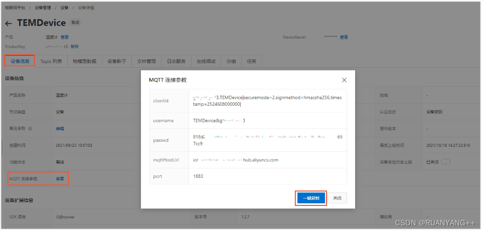 创建设备成功后,在弹出的添加完成对话框,单击一键复制设备证书获取设备证书。