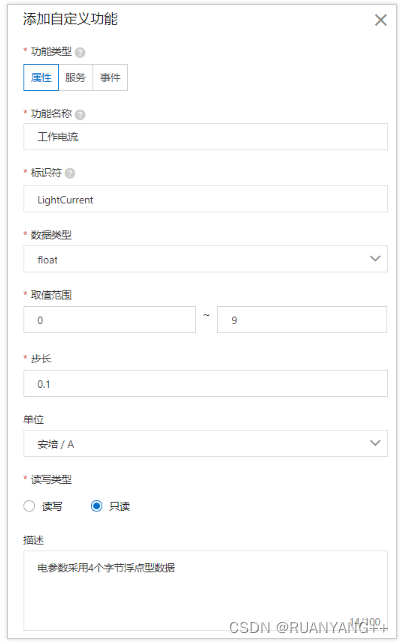 5.在功能定义页面的默认模块,单击添加自定义功能,进行物模型配置,然后单击确认。
