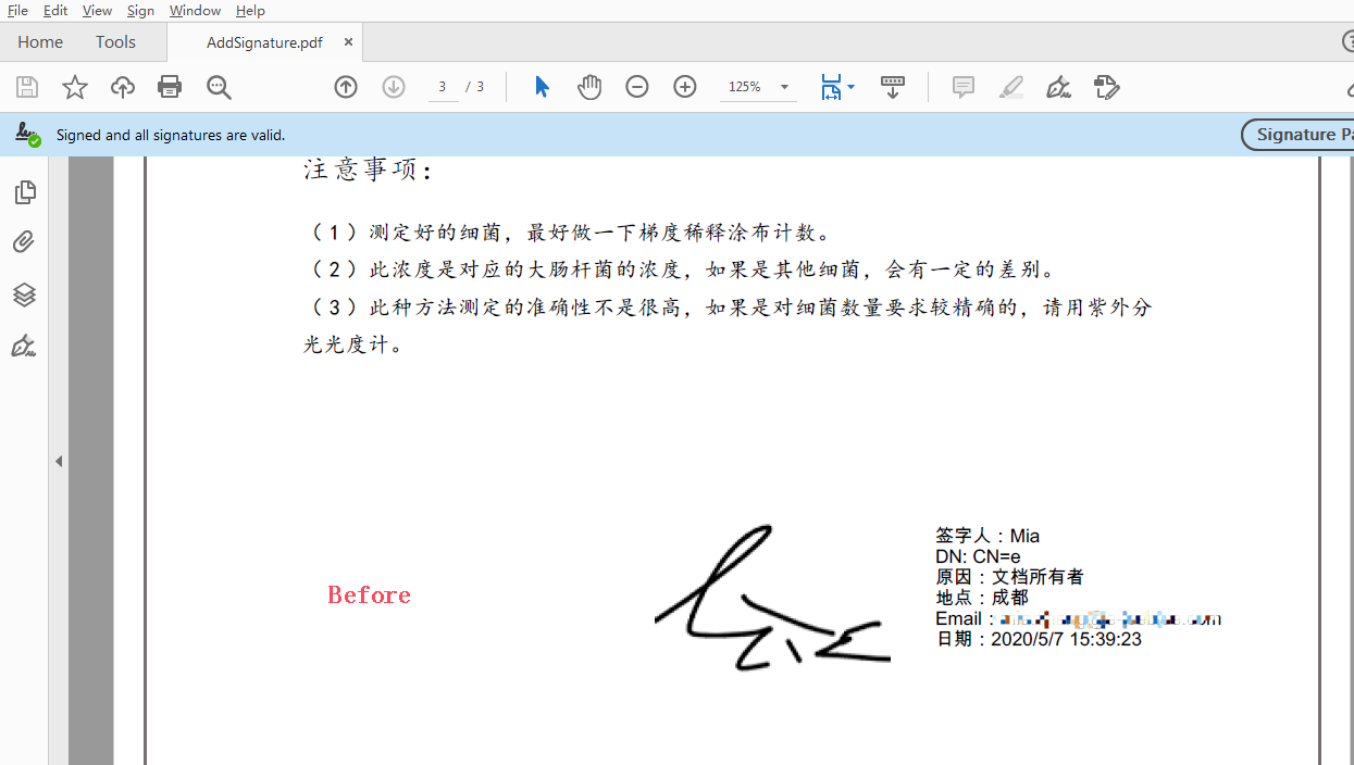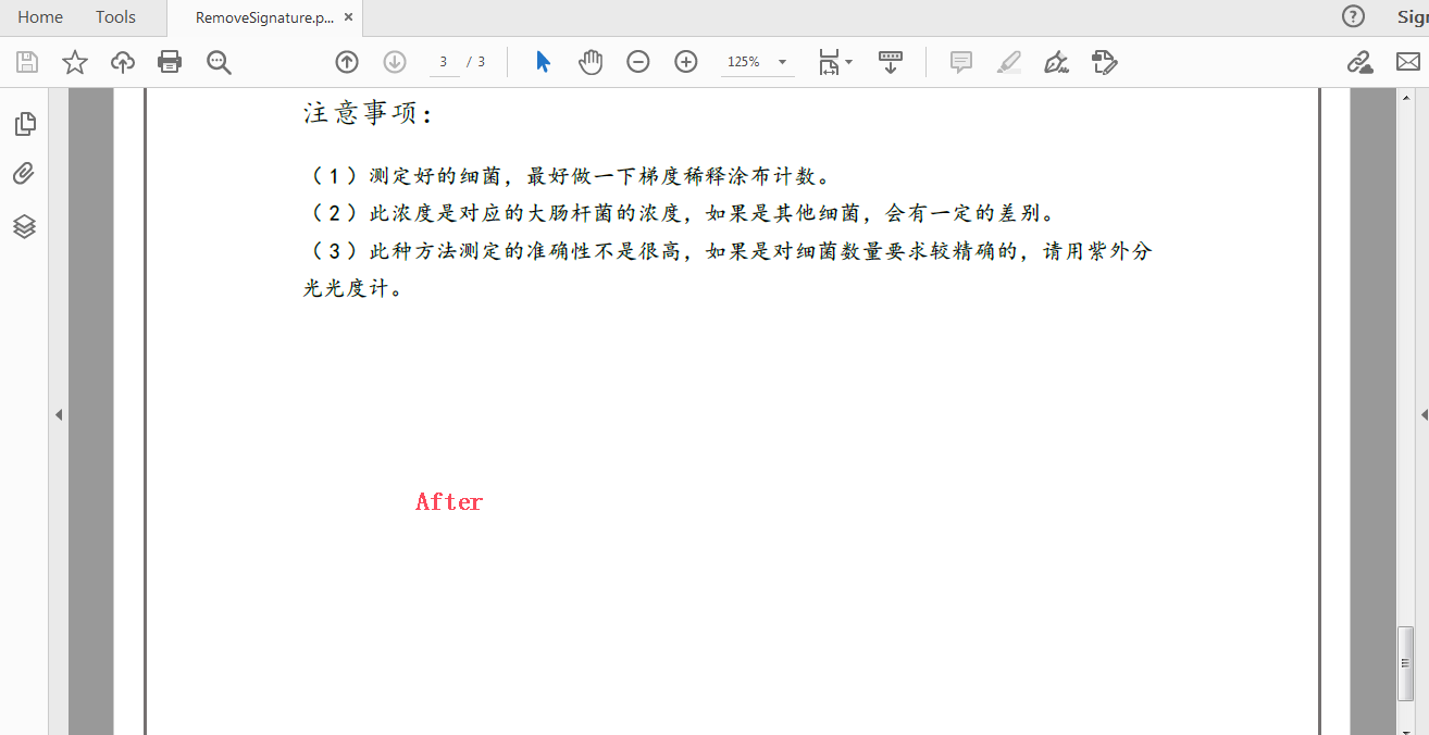 import com.spire.pdf.widget.PdfSignatureFieldWidget;public class DeleteSignature {public static void main(String[] args) {//创建PdfDocument对象PdfDocument pdf = new PdfDocument();//加载PDF文档pdf.loadFromFile("AddSignature.pdf");//从文档获取form widget集合PdfFormWidget widgets = (PdfFormWidget) pdf.getForm();//遍历集合中的每一个元素for (int i = 0; i < widgets.getFieldsWidget().getList().size(); i++){//获取指定widgetPdfFieldWidget widget = (PdfFieldWidget)widgets.getFieldsWidget().getList().get(i);//判断widget是否为PdfSignatureFieldWidgetif (widget instanceof PdfSignatureFieldWidget){//删除数字签名widgetwidgets.getFieldsWidget().remove(widget);}}//保存文档pdf.saveToFile("RemoveSignature.pdf");pdf.dispose();}