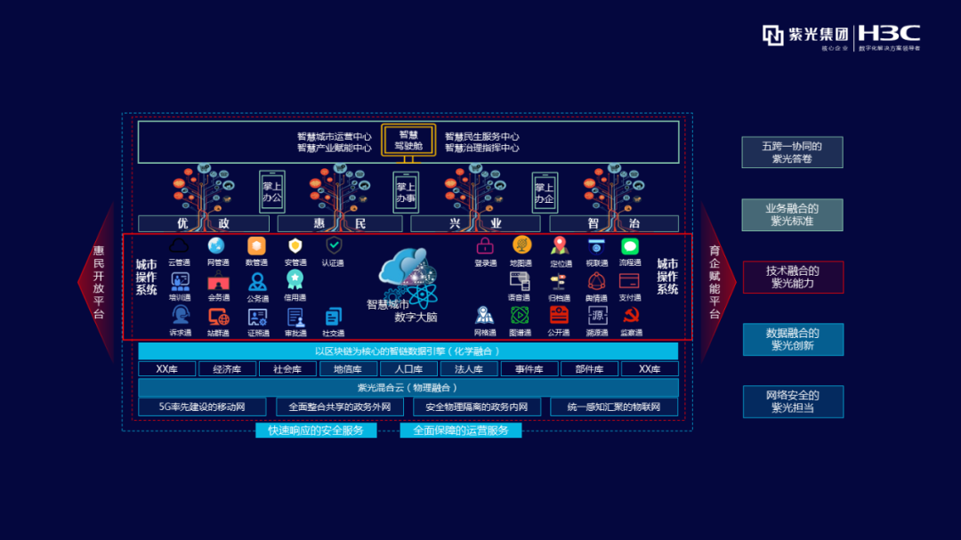 新华三集团在智慧城市中,构建了城市数字大脑,囊括了数字基础设施、云与智能平台、主动安全、统一运维以及上层丰富的智慧型应用生态。