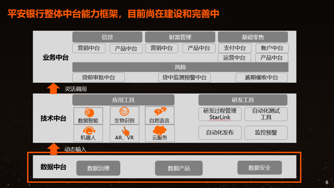 技术中台分为应用工具类和研发工具类。应用工具类,智能化公共服务、公共算法都是依靠平安集团的技术支持;研发工具,交付诉求必须靠自动化研发过程来实现,所以研发过程的工具本身也成为技术中台能力。业务中台,每个大的业务板块需要建立的中台能力。