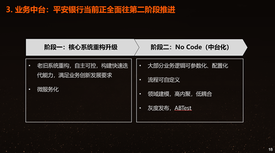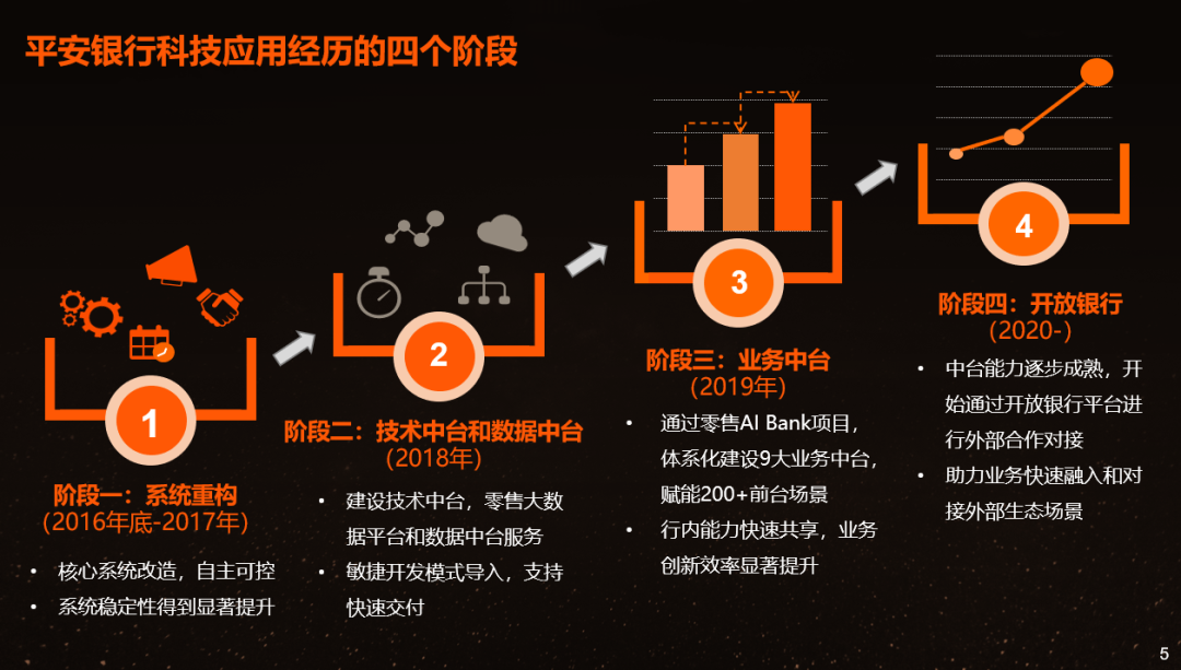 阶段三:业务中台(2019年),通过智能化体系改造业务,通过零售AIBank项目,体系化建设11大业务中台能力,赋能480多个前台场景。
