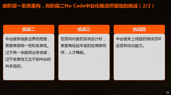 第二步,中台化NoCode,大部分业务逻辑可参数化、配置化、流程可自定义,领域建模,高内聚、低耦合,灰度发布,ABTest,确保未来可以快速测试验收。