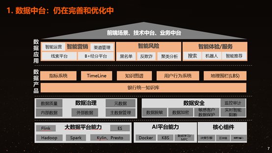 接下来是讲的技术中台,举个例子:智能语音平台。我们现在有70多个语音场景,完全由机器人完成与客户互动的语音场景,还有14个在实施过程中,每日的外呼量70万通电话,通话完成率大于70%。在建设过程中,最开始要投200左右的座席去做语音标注,不要想象今天智能语音找一个厂商的软件过来,就可以正式使用,因为在识别率和场景接入效率会比较低,一定是需要经过与内部业务场景的深度训练和结合的过程。如果每一个场景都做一次效率很低,我们当时是通过几个大的场景把完整的中台能力孵化出来,未来新场景接入效率可以变得非常高。