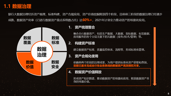 数据治理分为几个阶段:第一阶段是做到数据覆盖;第二阶段开始建立数据标准;第三阶段是建立安全应用规则建立;第四是创造数据价值,基本上形成这样的循环。目前做到数据资产化率,资产化率是什么?全量数据库数据里面大概有60%左右是能够进入到大数据的标签体系,而通过标签体系能够对外输出产生一定的调用价值,我们称之为数据资产。资产化率,意思是已有一些业务利用这些数据标签产生价值,我们大概有60%的数据可以做到这一点。