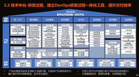 这是研发团队关心的,就是数字化、一体化的DevOps研发过程一体化工具。传统意义上的开发过程全部做到工具化、线上化,把它整合成一套完整的工具,而且把研发过程管控放在这个平台上能够实现。通过过程的管理,可以看出研发效率和研发过程中的质量问题,这是一个很重要的管理体系。最终可以发现一直延伸到发布管理、自动化发布,可以想象未来成熟的金融企业发布可以随时上线版本。这是我们未来要追求的,尽量让应用灰度发布。