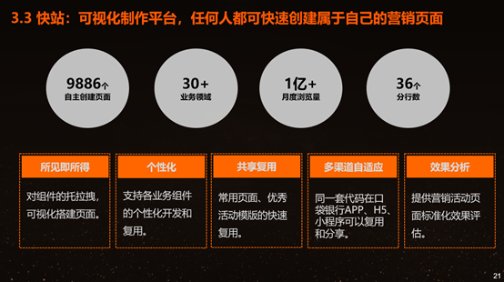 快站就是为营销活动开发一套完整的业务体系,让业务人员编排营销活动页面,把所有营销活动内容、广告图片、素材标准化,把营销活动规则全部都系统化,变成自动化的工具。到目前为止,我们自主创建了接近1万个页面,覆盖30多个业务领域,每个月营销活动流量达1亿。这个系统做到了所见即所得、可视化搭建页面、支持各业务组件,而且与业务系统结合紧密,高度共享,多渠道自适应,在各种小程序上都可以自适应,可以通过后台运营管理分析体系快速评估效果。
