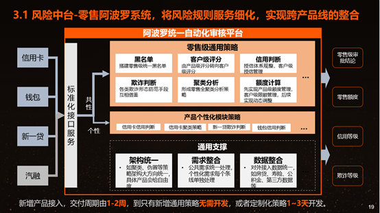 受今年疫情影响,我们在去年搭建了全行统一的催收平台,基本上所有零售业务催收都可以按照这样的架构进行标准化的作业和管理,大幅提升催收效率,基本上每一个新产品的催收接入,可以在1周内完成相关规则配置,经历 2周的规则验证后即可正式投产。