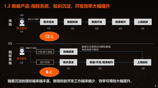 数据治理做好后产生的效果是什么呢?以我们的指标系统为例,比如传统给行领导、分支行行长、团队长提供管理决策数据的系统,从需求澄清、数据探源、数据开发、报表制作、上线验收,需要12天的开发周期。我们建立指标系统进行指标沉淀和重用,越来越多的指标可以直接继承和拖拽,不需要重复开发,大幅缩短开发周期,譬如6天就可以完成交付。