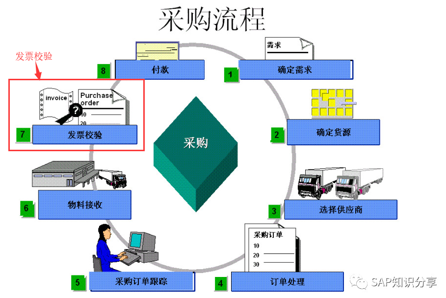 对于上述业务,SAP系统中提供了专门的发票校验功能,对于标准的采购流程来说,发票校验是处于整个采购流程的末端,当发票校验完成后,企业财务部才能给供应商进行付款。具体流程如下图所示:
