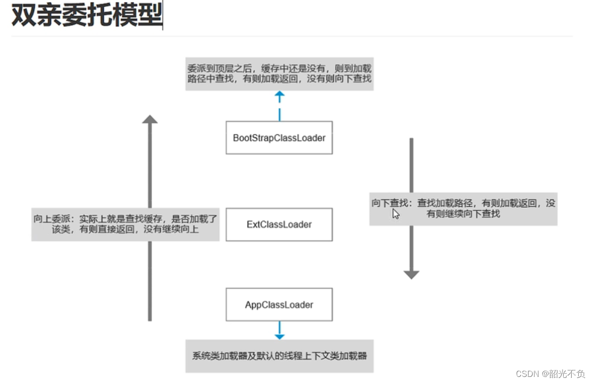 一个程序的启动从main函开始,appClassLoader加载器就会开始向上委派(查找appClassLoader到顶级加载器BootStrapClassLoader查找缓存) ,当缓存找到就返回,如果在顶级加载器都没有找到就会向下查找(从顶级加载器到发起加载器进行路径查找)。找到就返回,没有找到就返回找不到