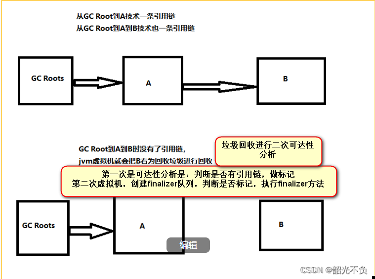 从GC Roots开始向下搜索,搜索所有的路径称为引用链,当一个对象到GC Roots没有引用链时,就证明该对象是不看用的,虚拟机(jvm)判断该对象是可以回收的对象