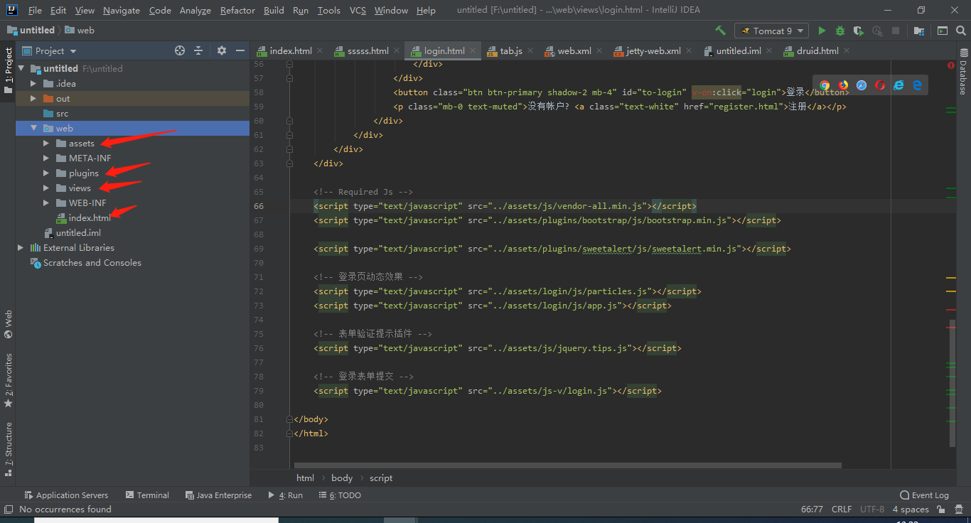 1丶一般按图新建项目之后,手动把自己的前端文件复制到web目录下面,其他不用管。如下图所示,标记的都是需要用到的前端文件。