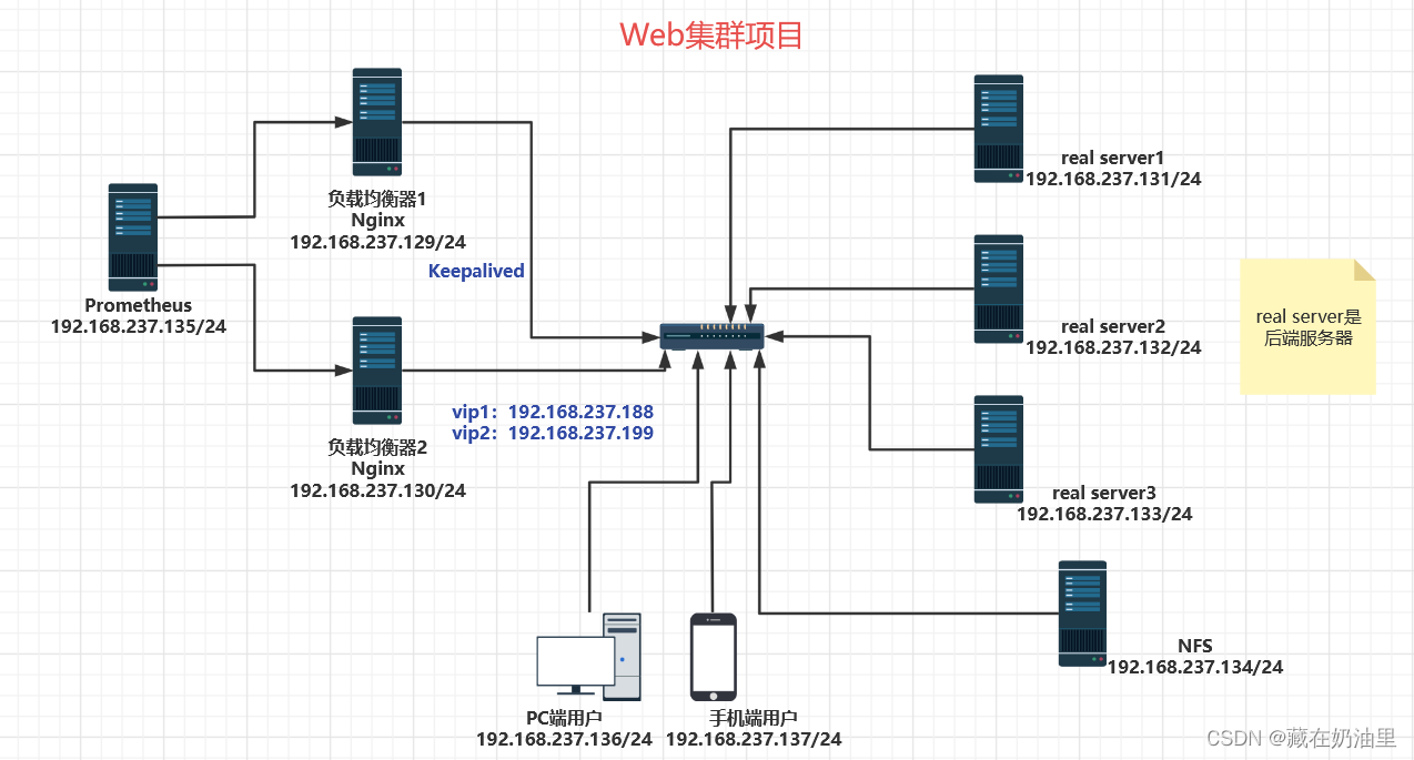 本项目是基于Nginx做负载均衡,Keepalived的双vip实现高可用,NFS实现文件共享,同时使用Prometheus+Grafana进行Web服务器监控的项目。考虑到企业对于高并发和高可用的追求,本项目模拟企业的业务环境构建一个Web集群,并通过压力测试来检验其性能,寻找优化的可能。
