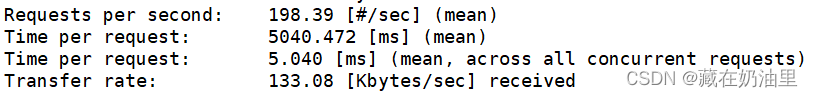 Requests per second:吞吐率,最关心的指标之一,相当于 LR 中的每秒事务数,后面括号中的 mean 表示这是一个平均值。