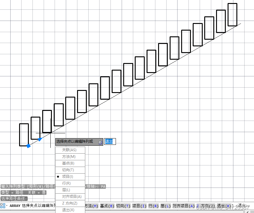 array -> 选择对象-> 极轴(po) ->选择路径曲线 ->选择项目 ->输入阵列中的项目数