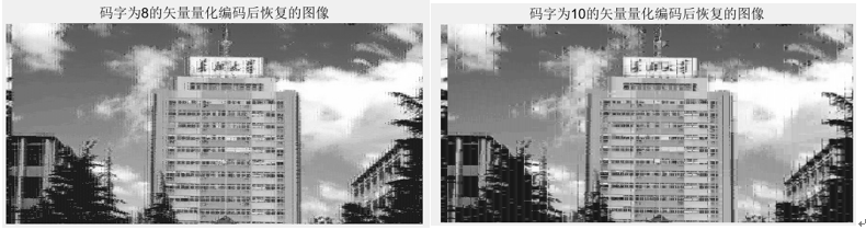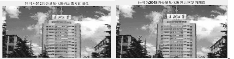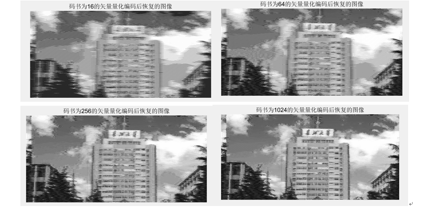 从课本和实际操作的过程中,我们知道随着码本的大小的增加,我们对图像的压缩比在不断缩小,所以图像的重构也越来越接近原始灰度化的图像,从上图的实例中也可以证明这一点。观察这些重构后的图像,可以看出当使用大小为1024的码本进行重构时,其结果与原图像最为相近,相比较而言,如果重构时选择使用的码本中包括16个重构矢量时,则可以在所得到的图像中看到大量伪像。