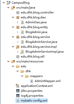 在实现Spring+mybatis的整合,成功完成表信息的查询显示后的项目结构如图:
